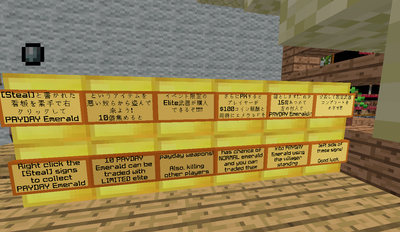 そろそろ風邪も流行ってくる頃なのでみなさん体調管理はしっかりしてくださいね! それより今日the Warに入ろうとしたら接続人数が3桁超えててびっくりした あちゅんなのであった(*´ڡ`●) という事で!!!!!!! 期間限定イベントの紹介!!! いってみましょ~~~~~~~~~~~~~~~~~~! 今回のイベントでは~~~~~~~~~~~ でででん!\( ・ٹ・)/ 3種類の武器が手に入ります☆ これみんな赤武器なんだってさ(*´・ω・)(・ω・`*)サー ということでイベントの説明します!!(*´﹃`*) その名も・・・ PAYDAY Emeraldを手にいれて 限定武器を手に入れよう! です(*´ڡ`●)長い????しらんがな! 今回のイベント会場はHuntです! Huntに行きますと説明書きがありますのでそれを読みましょう! [Steal]と書かれた看板を素手で右クリックして、 PAYDAY Emeraldというアイテムを悪い奴から盗んで集めるみたいです(*´꒳`*) そのダイヤを10を集めるとイベント限定武器が手に入るみたいです!!! 場所は内緒だけどこんな感じ! ふむふむ。宝探しみたいですね。面白そう! ちなみに!!!!!!!!!!!!!! プレイヤーからもエメラルドが落ちるみたいで それを16個集めるとPAYDAY Emeraldが1つ手に入るみたいですよ☆ みんなも集めてみてくださいね!!! さりげなくだけど・・・ エンダーチェストの容量が増えたみたいです! アイテムいっぱいあったから困ってた所なんだよね! ではでは~~~~! 2013.10.06 Sun 22:04:36 【新要素】レアがちゃ入荷しました今まで定期的に開催されていたガチャイベントですが・・・